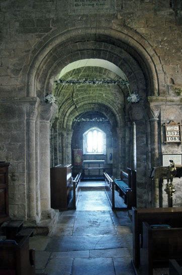 “Underneath the Arches”. Left: Looking east from the east end of the nave. Centre: Looking east from from underneath the tower. The arch through to the sanctuary shows major cracking, caused by the weight of the tower built on inadequate foundations of sand and old graves! It was rectified in 1881. Right: :Looking west from beneath the tower. These are early Norman arches. The exuberant courses of decoration that would adorn many arches and doorways of the later Norman period are yet to appear.