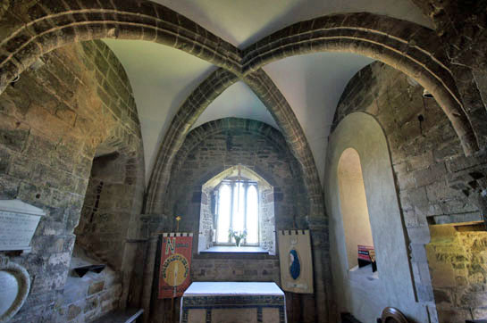 Left: The gloomy interior looking from west to east. Right: The sanctuary has a quadripartite vault. The ribs are very plain and there is no central carved boss.The rather odd Gothic window in the east end is one of the few bits of “modernisation” this church has sustained.