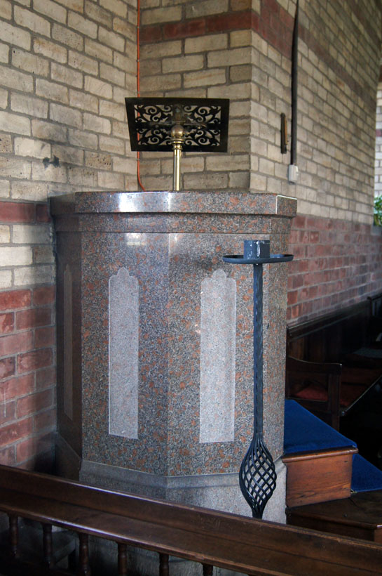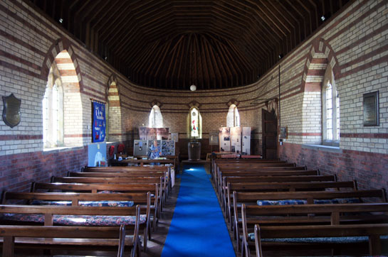 Left: The view towards the east with its lovely two-tone LNWR brickwork. Note the faux Early English triple lancet window. Note also the stone pulpit which matches the stone font. Right: The view west with its unusual apsidal shape. Note the railway bench seats!