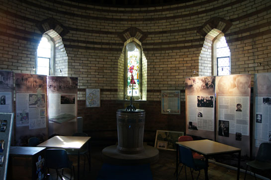 Left: Looking into the apse. There is a display here explaining the church’s history and quite a lot of information about the railways. Note the beautifully-constructed window rebates. Right: The rather lovely roof beams over the apse.
