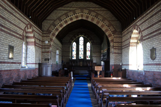 Left: The view towards the east with its lovely two-tone LNWR brickwork. Note the faux Early English triple lancet window. Note also the stone pulpit which matches the stone font. Right: The view west with its unusual apsidal shape. Note the railway bench seats!