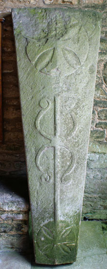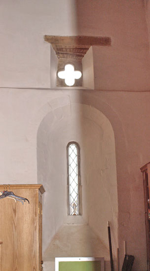 Left: Looking through from the north aisle to the north chapel through a round-headed arch that might well, like the transept arch, date from 1230 despite its round profile. Note the cut-off doorway on the left to the original rood loft. Centre: The vestry contains this Norman lancet window with a quatrefoil window above. Right: A mediaeval coffin lid preserved in the north porch.