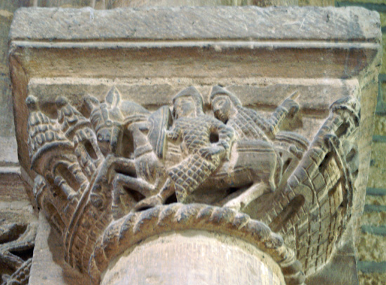 Left: The lion’s face. Right: And so to the exciting chancel arch north capital. Two knights in chain mail and Norman-style helmets, one with a shield, and with one horse between them are flanked by two Byzantine-style buildings - or one, depending on your view.