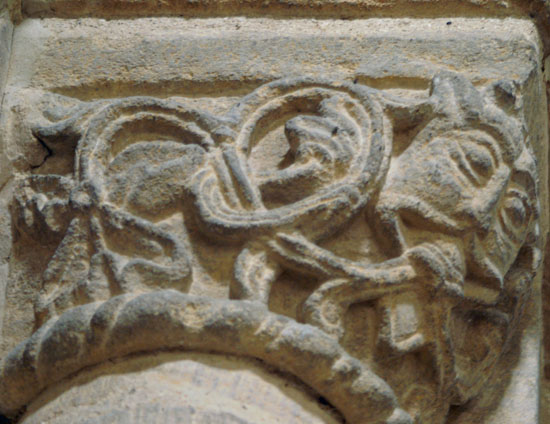 Both chancel arch capitals are excellent, but it is not stretching it to say that the one on the north side is remarkable. Here we see two mounted knights (although only one horse is visible). To left and right of them are Romanesque buildings - whether it is intended to be one or two is open to question. The Church Guide (following Pevsner) describe this as “two knights and a castle”. This, it seems to me, is breathtakingly simplistic! To start with, the building (or two buildings) do not look like castles at all. To the left we see towers with conical tops. To the right more of the same plus a dome. There is no evidence that they are castles - but whatever they are, they are most certainly NOT representations of anything in Norman England! Norman castles were mainly wooden “motte and bailey” designs and, where they were of stone, they were square as at, for example, the Tower of London. There most certainly was no tradition of domes in Western European architecture at this time. This was the preserve of first the Greeks, then the Romans and latterly the Byzantines. No English builders knew how to build a dome. For more, please follow this link :Early Church Design