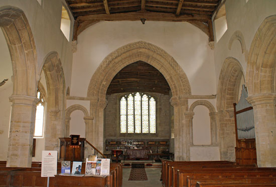 Left: Looking towards the east. The chancel arch is clearly rebuilt from the original Norman. Note the blank Norman niches to either side of it. Right: The shallow c15 chancel with Perpendicular east Window