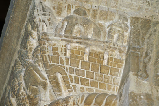 A closer look at the mounted knights. Note that the horse’s harness is visible, as are reins and even a shield boss. You can only see one horse in this scene so I have speculated that this is a “two knights on one horse” motif of the Knights Templar. There are two problems with the this theory: firstly that the second knight is not shown astride the horse when it seems it would have been relatively easy to have depicted him thus. Secondly that we know of no Templar connection with Wakerley. The nearest preceptory was at South Witham about eighteen miles north and it wasn’t founded until 1164. That does not mean that there were no Templar lands in Wakerley, but if there were then I can find no record. In terms of chronology it would be a marginal call to say the least. The First Crusade was 1096-9 and resulted in the capture of Jerusalem. The usual date postulated for this church is around 1120. To be celebrating the recapture of Jerusalem in a church at this time would seem to me to be extremely plausible. I can’t over-emphasise my conviction that the buildings depicted here are NOT western architecture. I am convinced in my own mind that this carving depicts the First Crusade. The Knights Templar, however, were founded by Hugue de Payens in 1119 and were granted space in the Al Aqsa Mosque on Temple Mount in Jerusalem giving the Templars their name. I would go so far as to suggest that the domed building in this scene might be a representation of the Dome of the Rock itself. If the church was indeed built in 1120 then I would suggest that the Templars would not have been sufficiently well known then for a carving here to be plausible. If it was later and by the man who carved the Priors Door at Ely then it becomes a bit more plausible. Putting all this together I am doubtful about a Templar connection - I am sad to say!