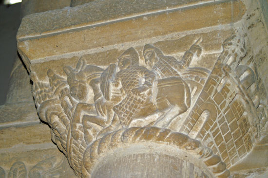 Left: The lion’s face. Right: And so to the exciting chancel arch north capital. Two knights in chain mail and Norman-style helmets, one with a shield, and with one horse between them are flanked by two Byzantine-style buildings - or one, depending on your view.