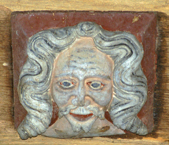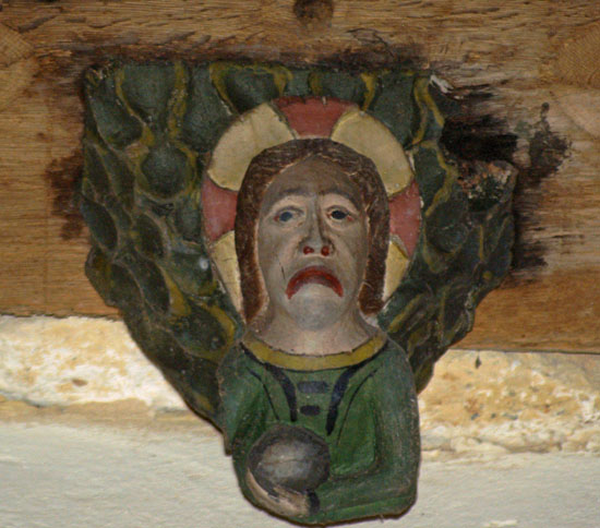 Here are the roof bosses - and a strange lot they are too! Top left is a genial-looking man. Bottom Left: I was convinced that this is St Mary Magdalene. She is often represented with long red hair and carrying a pot of perfume which she used to anoint Christ’s feet before he rode into Bethlehem. The hair is long and may have been red - the traditional way of representing the much-maligned Mary Magdalene. Or is it brown? However a correspondent, Alan Murray-Rust, has pointed out that this form of halo is reserved for images of God or Christ. He was sometimes represented holding an orb, not least by Michaelangelo, so that makes sense. Yet this is a most bizarre representation of Christ. He is beardless, frowning in a most unwelcoming way and strangely dressed. Either way, have you ever seen Christ depicted thus? No, me neither! Maybe it is meant to be a depiction of the young Jesus. His face looks rather like his mum’s caught him with his fingers in the cookie jar! Maybe after all it is Mary Magdalene depicted by a carver unaware of the special significance of the cruciform halo?