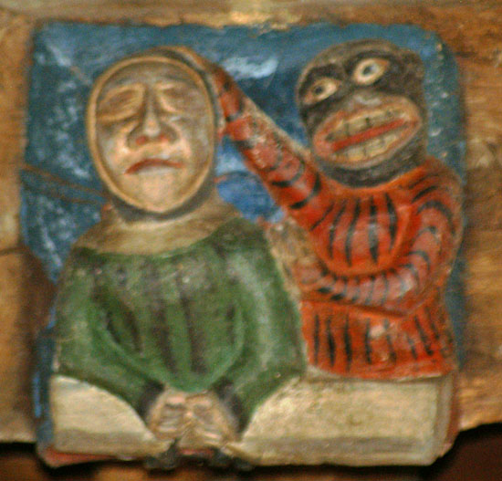The other two above are anybody’s guess! On the left hand carving the two people seem to be carrying whips - or are they fetters? - while a black creature looks over their shoulders. On the right is a downright weird image of another black creature with striped fur - or else a black man in strange clothes. In both cases the figures seem to be standing beyond a table of some sort. I speculated rather fancifully that they look like characters from a mediaeval puppet show or drama. There is, after all, a playful air about these carvings. Alan Murray-Rust believes the left hand picture depicts Adam & Eve with the Devil. But he can’t explain those things in their hands either. Whips are a symbol of penance so that’s just about consistent with Alan’s theory. You might think, as I do, that it would be odd to depict Adam & Eve in contemporary costumes. So perhaps these are good old fashioned everyday sinners? You know, like you and me? The bosses are undated by the Church Guide which points out that the roof was reconstructed in 1737. “Eve’s” headdress, however, is of a distinctive “gabled” style so I think fifteenth century is a pretty accurate estimate.