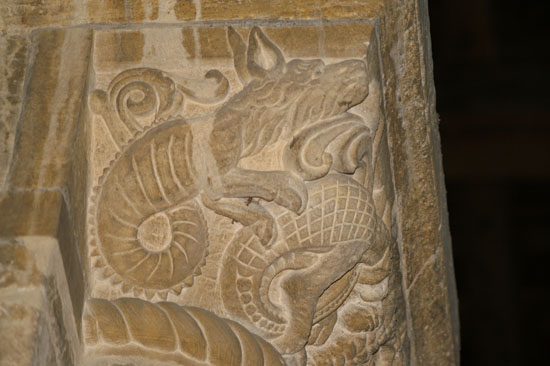 Left: The final piece of the apocalyptic scene on the eastern respond is this creature with a dog-like face, boar-like ears and a segmented tail complete with protruding scales! Right: The half-pier on the south side has this image of inter-twined foliage spewing from the mouth of a cat or a lion.