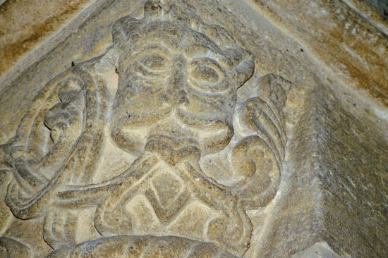 Just a final word on these carved capitals. First of all, they are much more ambitious than those at Castor. So much so that it hard, in my view, to equate them. Cleverer people than myself, however, feel able to make a connection so I’m not about to argue. The dog-headed figure on the south capital resembles a jackal. The ears are long and the jaws pronounced. It might not be a dog at all! Anyway I will leave you to decide whether the jackal head at Wakerley matches the one pictured below at Castor.