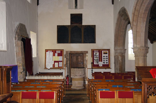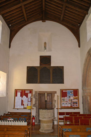 Left: The chancel dates from 1902 although I’m not sure you would know that without being told. The east window is, admittedly, a bit of giveaway with its too-regular tracery and shortened height but then many east windows are Victorian replacements. Otherwise, it is a surprisingly tasteful re-creation and probably not dissimilar from the original. Right: Looking towards the east end. The west door is surprisingly lintelled, although this might not be its original form, of course. The south doorway (on the right) is a no-nonsense affair with enormous jambs protruding into the church im most unorthodox fashion. The font is in the centre.