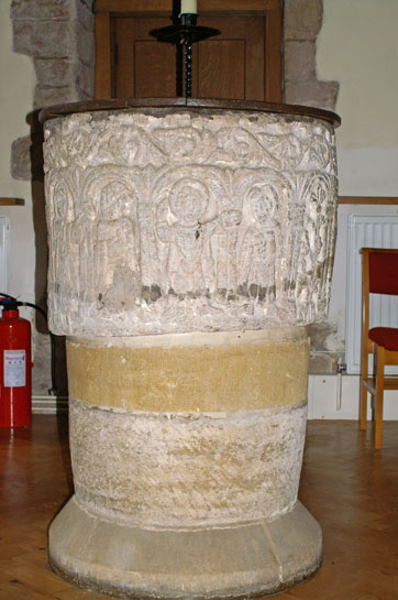 The font has arcading around its circumference which provides niches for figure carvings, a common Norman design. Unlike many other such Norman (such as Coleshill in Warwickshire) this one is not populated by Christ and his Apostles. Three of the panels have decorative motifs. Then have figures some of which are apparently unidentifiable laymen with long coats. Two of these are fighting each other with clubs or maces and bearing under-sized heart-shaped shields. Whoever they are meant to be they certainly are not Norman soldiers who would have been bearing kite-shaped shields. It is a mystery what such a martial scene is doing on a font. It is, however, not unique in that respect. as you can see on the font at Eardisley in Herefordshire that is one of England’s very finest.