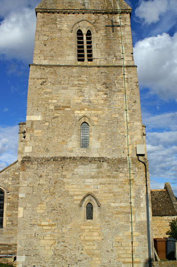 Above: The tower. Note the crude drip moulds over the windows. The louvred bell opening is in a rather distressed state