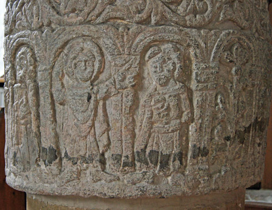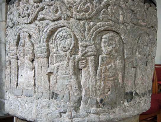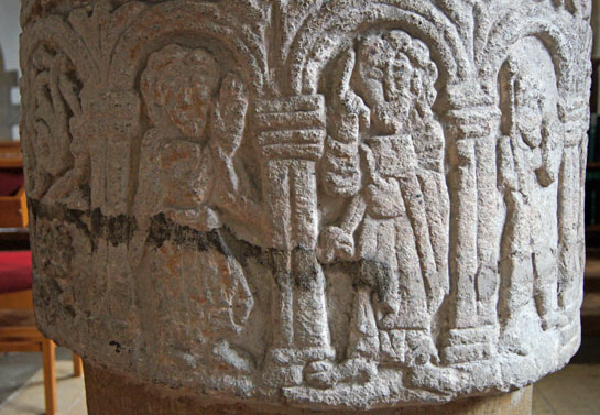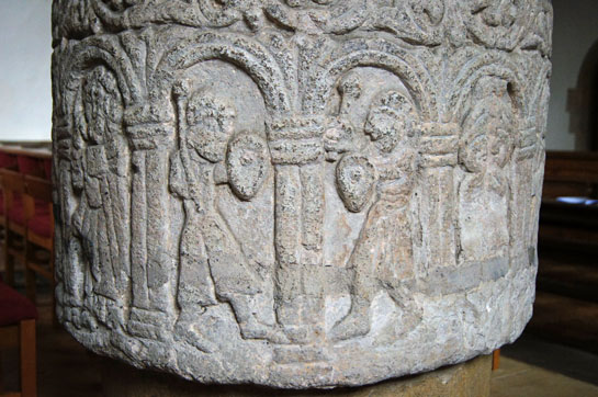 On either side of these two soldiers are priests holding up their hands in benediction. Elsewhere is supposedly the scene of Christ’s baptism though I confess I could not spot it myself! Overall, it is not in the first rank of Norman fonts by any means but it is an ambitious design executed in vibrant style.