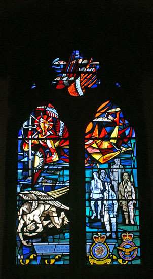 Left: Looking towards the c14 north chapel which has RAF colours hanging from its roof, and a stained glass tribute to the RAF (see picture far right). Centre: The massive piers and impost blocks of the chancel arch. Right: The modern but attractive RAF window.