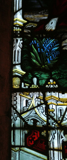 Left: The east window is by renowned Victorian stained glass window artist, Thomas Kempe in 1903. On the extreme left, about halfway down, can be seen his “trademark” of a wheatsheaf. Centre: Saxon “long and short work” between chancel and nave. Right: More long and short work at the quoins of the east end. Note also the original roof line.