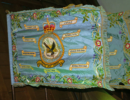 There a 5 sets of colours in all hanging in the north chapel. The nearest set, shown in close up (right) are of 20 Squadron RAF. I reproduce this information from Wikipaedia: “In the First World War 20 Squadron RFC & RAF was arguably the highest scoring and possibly most decorated British fighter squadron on the Western Front with 613 combat victories, a posthumous Victoria Cross won by Thomas Motterhead, four Distinguished Conduct Medals, and over sixty Military Crosses and Military Medals awarded to its members. Its ranks included over two score flying aces.” Wow! For more information see: http://en.wikipedia.org/wiki/No._20_Squadron_RAF