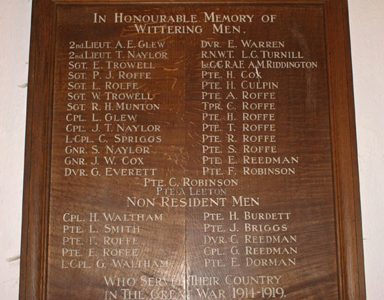 It is hardly unusual to find a list of war casualties in an English parish church. Nor, where the First World War is concerned, to see the same surname repeated. The suffering of the Roffe family at Wittering, however, must surely have been beyond endurance? Their name appears nine times on this board. At a time when we are so conscious of our country’s losses in Afghanistan and Iraq to see this is sobering indeed. I doubt there was much in the way of trauma counselling for bereaved families in those days. The Chairman of Wittering Parish Council at the time of writing (February 2010) is Mr Richard Roffe!