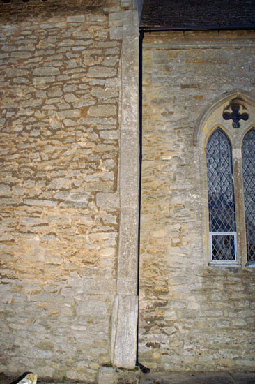The arcade is of only two bays and has the usual Norman decorations of lozenges, chevrons and the like. It also is well-preserved. The windows of the church are all Gothic replacements but this hardly seems to matter when compared with the church’s architectural assets. The quoins linking the chancel to the nave are excellent examples of Saxon “Long and Short Work” (see picture below). Although it is not immediately visible to the untrained eye, these stone courses also are examples of the technique of “entasis” whereby the lines bow out towards the base and slope slightly inwards towards the eaves in order to correct the tendency for vertical courses to appear concave. Apparently, there are other explanations for its use and I would refer you to http://en.wikipedia.org/wiki/Entasis. Whatever you choose to believe, it is yet further evidence that our Saxon forefathers were not the boneheads that some older history books would have had us believe!