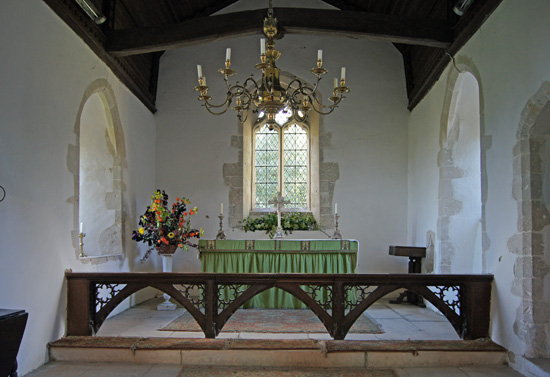 The simple and unadorned chancel. The east wall was remodelled in the c18. It is a relief that an appropriately simple and restrained east window was retained.