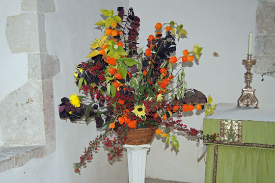 Top Left and Centre: The rather modern-looking chancel arch label stops. They are nicely done, unlike many modern copies of mediaeval sculptures that look like they were designed to be sold in garden centres! They reinforce, however, the fact that the chancel arch has been tampered with, possible during the c18 re-modelling of the east wall. Above and Right: We visited on 15 October 2012 on a lovely day, and the early afternoon sun was pouring into this timeless lively little church. Someone had done these beautiful floral arrangements to add to an idyllic scene. Perhaps that font was always destined to be a plant pot…only joking!