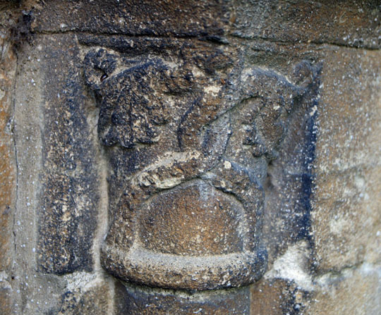 Left: The Transitional North door - the current entrance to the church. Unlike the south door, this one looks what we see now is its original form. Centre and Right: The badly-weathered but still fascinating north door label stops. These pagan images really don’t look in keeping with the this otherwise restrained doorway.