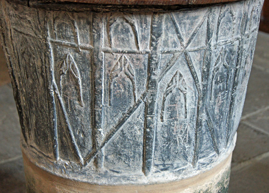 Two views of the peculiar font. The vertical pilasters look to have been “drawn” freehand and the odd “gothic window” motif looks like it has been done using patterning stamp of some sort, with little attention to precise placement. There is no real sense of art here at all. What on earth are those diagonal lines for? If you didn’t know any better you might think it was something a primary school class had fashioned from clay! There are clusters of lead fonts in both Oxfordshire (although Woolstone was in Berkshire until 1974) and in Gloucestershire. Presumably both “schools” owe their existence to the lead smelter of the Forest of Dean. Let’s not mince our words, this is a rare example of a really ugly font - but there is something engaging about the work of the well-meaning bodger, isn’t there?
