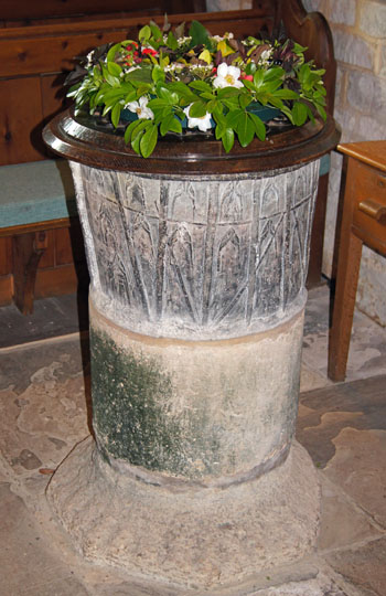 Two views of the peculiar font. The vertical pilasters look to have been “drawn” freehand and the odd “gothic window” motif looks like it has been done using patterning stamp of some sort, with little attention to precise placement. There is no real sense of art here at all. What on earth are those diagonal lines for? If you didn’t know any better you might think it was something a primary school class had fashioned from clay! There are clusters of lead fonts in both Oxfordshire (although Woolstone was in Berkshire until 1974) and in Gloucestershire. Presumably both “schools” owe their existence to the lead smelter of the Forest of Dean. Let’s not mince our words, this is a rare example of a really ugly font - but there is something engaging about the work of the well-meaning bodger, isn’t there?