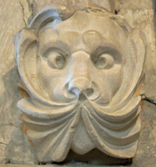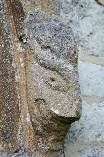 Left: The Transitional North door - the current entrance to the church. Unlike the south door, this one looks what we see now is its original form. Centre and Right: The badly-weathered but still fascinating north door label stops. These pagan images really don’t look in keeping with the this otherwise restrained doorway.