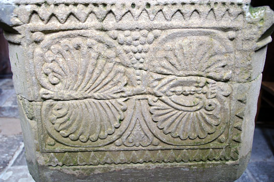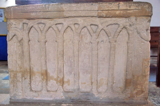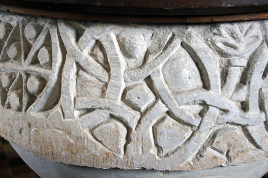 Left: One side of the font shows a Tree of Life motif. Right: The last refuge of the Norman font carver who was fresh out of ideas was, it seems, a length of “blind arcading” that became such a fashionable device throughout the late Norman and Early English periods. The problem was that our carver, like so many of his contemporaries, found that the draughtsmanship required rather outstripped his abilities! Some of the lengths of blind arcading adorning the outsides of churches especially in the Early English period were exquisitely executed. Take a look, for example at the west end of Felmersham Church in Bedfordshire. Some Norman fonts are amongst the finest artistic work of the Mediaeval period but it is clear that font carving was sometimes delegated to the odd job man!