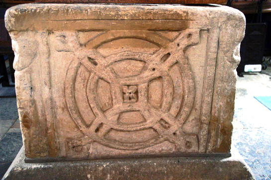 Left: The north chancel wall. The herringbone masonry courses to the left of the doorway and arched window are what give rise to the putative Anglo-Saxon dating. To the right of the rectangular window you can discern the outline of a filled-in round headed window. This looks much too neat to be as early as AD950 . It is surely Norman. Centre: The font. Two green men-like faces are in evidence. They are divided by the tendrils emanating from their mouths and forming rather inventive fleurs de lys-like motifs. Right: Almost hidden against the south wall is the damaged circle interlaced by arcs which led to a great deal of shifting of stacked chairs by this excited writer. Of the examples on this page this is perhaps the most obviously Norman-looking with the pellet pattern on the circle itself. This emulates the font at Stone (and formerly of Hampstead Norries) in Buckinghamshire which piqued Mary Webb’s interest in the first place and where - uniquely - the full range of the neo-Platonic symbolism can be seen. It is a nice study of how the arcs are always entwined around the circle and not just lying underneath or below it. “Interlaced” is definitely the right word. Similarly, you can see that the inner design produces a square, the sides also interlaced. These are not accidental decorative designs: they have ancient philosophical significance and the masons had to get it right even if they hadn’t a clue what that meaning actually was. Just like countless generations of parishioners who gazed uncomprehendingly on it!