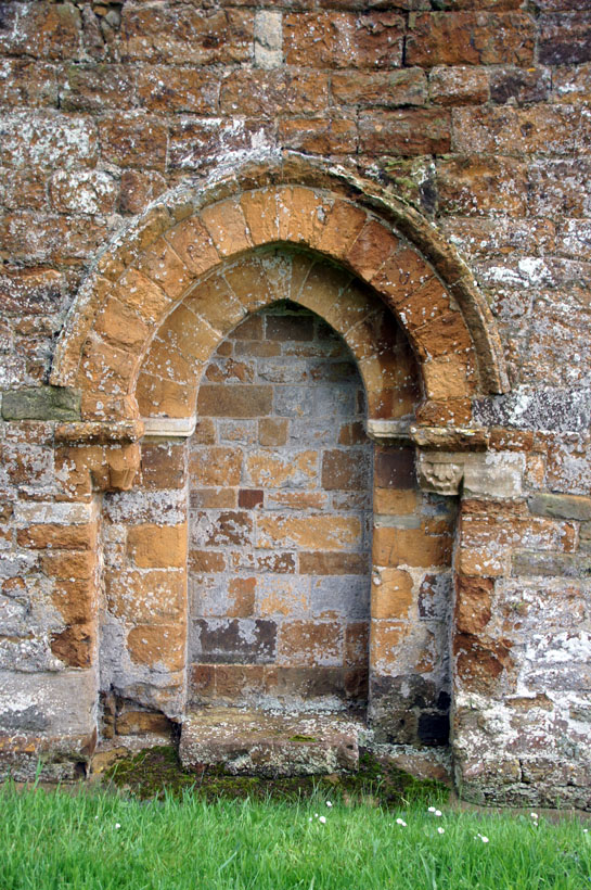 Like the other churches on this page, Aston-le-Walls Church has not attracted much attention from the historians. Leaving aside the Norman fonts, Aston Church has the clearest signs of Norman architecture. The lowest part of its tower with round-headed arches and deeply-splayed windows is clearly of this period. The blocked north door has a pointed arch but its capitals tell us that it is probably Transitional, possibly Early English. So it has an ancient core but c19 restoration has left little of interest. The font, like that at Braybrooke, is square in plan and, like that at Thornby, poorly executed. The circle interlaced with arcs motif (I really must find a shorter name for it!) is shown above right. What distinguishes this font from Braybrooke’s - apart from its poor quality - is that each corner has a carved face. Amongst others, most of the North Norfolk School of Norman fonts have this feature. Bob Trubshaw very plausibly ascribes such designs as representing the four rivers of paradise.