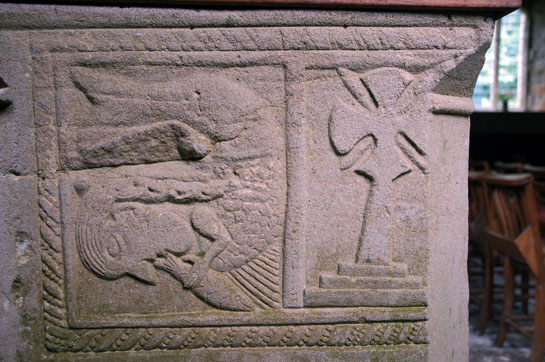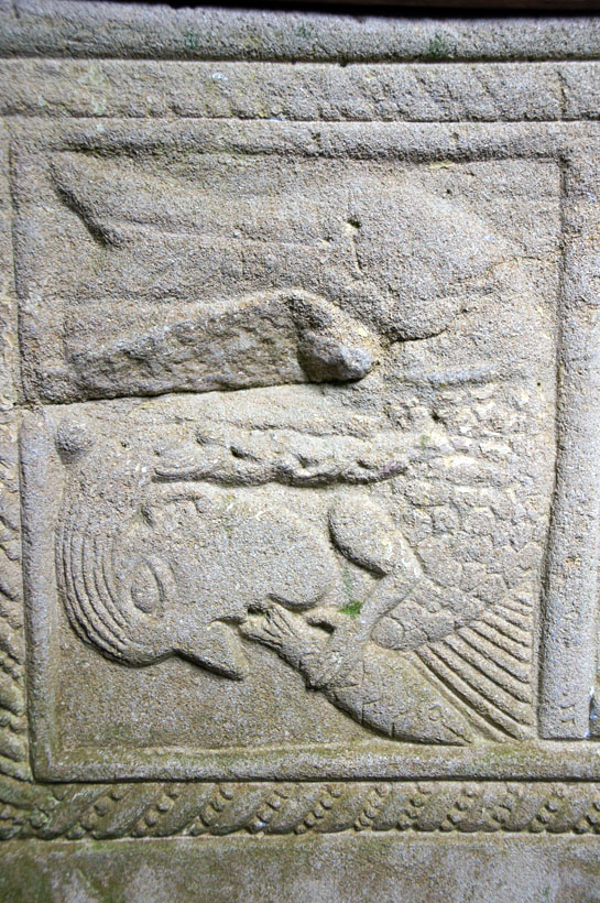 Above: This also is an enigmatic design. There is a merman - Pevsner saw it only as a “figure”, surely incorrectly - about to eat a fish, tail first! What can this mean? The mermaid was seen as an example of a “syren”. The syrens wre represented in Greek mythology, most famously in Homer’s “Odyssey” as luring hapless sailors onto rocks. The Christian church adopted this as an allegory for being lured from the path of righteousness and on this font it is a reasonable assumption that the fish about to be consumed represents a Christian who succumbed and is about to be devoured. Mary Webb was, however, intrigued by the “stepped cross” design to its right. She believed that the ascending steps of the cross were meant to contrast with the descent of the merman with its victim.