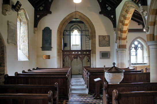 Both internally and externally, Thornby Church is an unassuming place. Pevsner dismisses of as “of little architectural interest” and it would be hard to disagree. It’s the usual hotchpotch of Gothic and Tudor styles with a c14 tower and some Victorian rebuilding. It’s a pleasant enough little church, though, both inside and out and there is something about that warm Northamptonshire ironstone (above left) that warms the heart. The use of contrasting stones in the north arcade of 1870 (above right) is a pleasant decorative device.